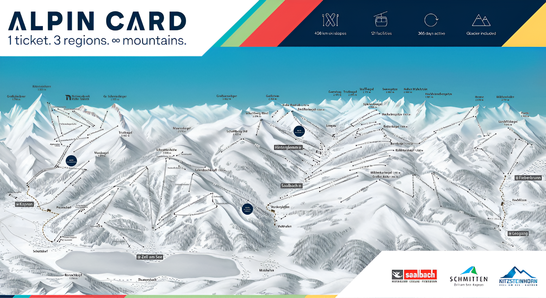 Ett av de starkaste argumenten för området är liftkortet. Ski ALPIN CARD ger automatiskt tillgång till tre premiumskidområden: Skicircus Saalbach Hinterglemm Leogang Fieberbrunn, Schmittenhöhe i Zell am See och Kitzsteinhorn-glaciären i Kaprun. Tillsammans innebär det 408 kilometer pister.