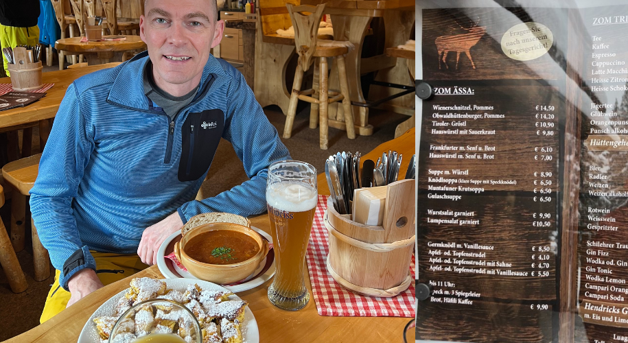 Vi hittade den klassiska österrikiska känslan på Obwaldhütte – ett måste om du vill ha genuin atmosfär, gullaschsoppa, Kaiserschmarrn och alkoholfri öl i solen.
