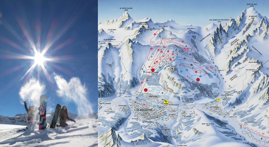 Courmayeur (1 224 m) ligger i dalen nedanför Mont Blanc (4 810 m), Europas högsta berg. Här hittar du ett klassiskt italienskt skidområde med två huvuddelar: Val Vény och Plan Chécrouit, som sträcker sig upp till en höjd av 2 755 meter vid Cresta d'Arp.