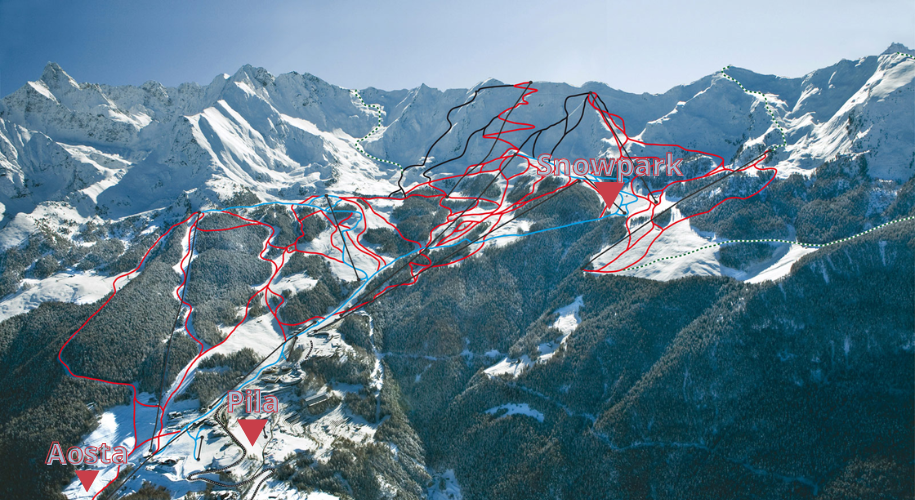 Pila ligger strax ovanför staden Aosta och kan nås via en 18 km lång väg eller en modern gondol som tar dig från stadens centrum till skidområdet på bara 18 minuter.