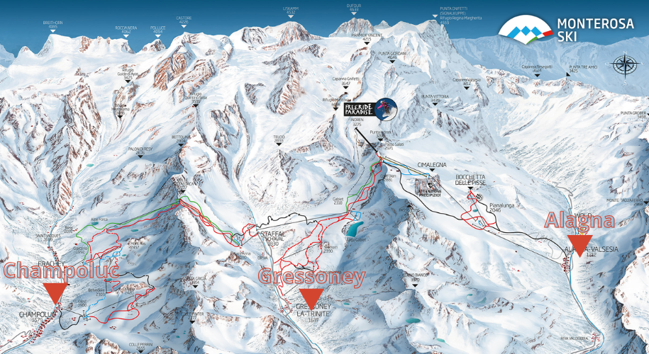 Monterosa Ski förbinder tre dalar i ett stort skidområde mellan Valle d'Aosta och Piemonte. Här ligger städerna Gressoney, Champoluc, Alagna och flera små byar, där den traditionella Walserkulturen fortfarande lever kvar i både arkitektur och livsstil.